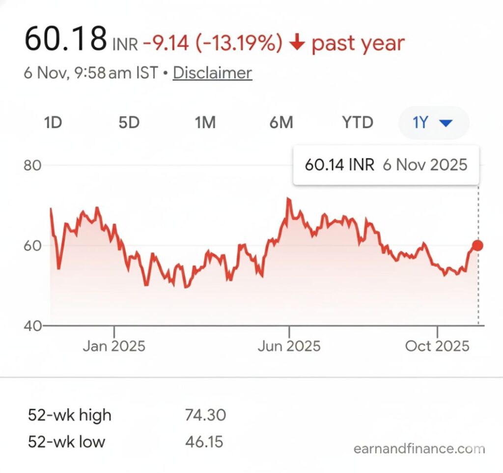पिछले 12 महीनों में इसने ₹46.15 का लो और ₹74.30 का हाई बनाया था। यानी, शेयर ने 60% से ज्यादा की वोलैटिलिटी दिखाई — जो बताता है कि निवेशक इसमें लगातार एक्टिव हैं।